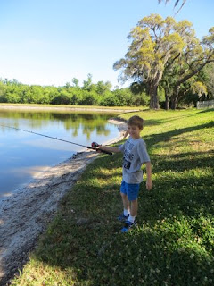 After we cleaned up the kitchen, wiped up the excess dye, and washed pairs of hands, we headed down to the little lake to fish. Papa bought all 3 of the Grands fishing poles....the boys are small rods and reels and Leighton's is a princess one. The boys had taken fishing classes and had been begging Papa to take them to the lake which is pretty much behind our house. Today was the day...no more practice in the swimming pool. No big fish stories but sure had lots of fun.