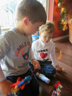 Both of the twins have bronchitis and their mama has an upper respiratory infection so Thanksgiving was a bit more sedate than usual. With one little guy sitting on Nana's lap sad because he did not feel good, the photos are rather limited. They did get their tree up with help from Uncle Rob, who then read The Christmas Crocodile to them while we got dinner on the table. The kids each got to pick a lemon from the limoncello trees (also known as a Myer lemon tree) and the boys actually ate slices. Without further ado, here are the photos I did take.